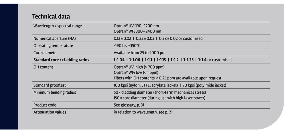 CeramOptec® 高品质的 Optran® UV 和 Optran® WF 光纤在深紫外到深红外范围内表现出色的性能和传输。凭借令人印象深刻的辐照抗性,Optran® UV 和 Optran® WF 是包括光谱学、汤姆逊散射和医学诊断在内的应用的理想选择。我们提供几种护套类型和尺寸的选择——以及根据您的规格定制设计的产品和尺寸。